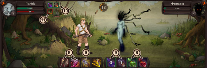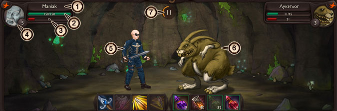 В левом верхнем углу находится информация о вас, в правом верхнем - о вашем противнике. В центре экрана разворачивается непосредственно бой, а по нижнему краю располагаются изображения способностей и боевых предметов, доступных к использованию.