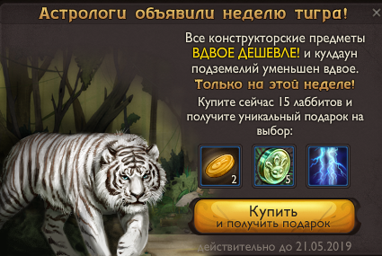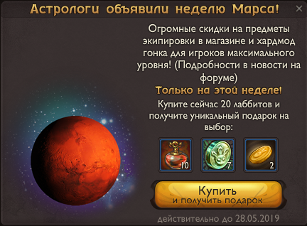 Обратите внимание, что эта неделя экспериментальная: при пополнении счета всего на 5 Лаббитов можно выбрать весьма достойный подарок. Кроме того, в игру внесены изменения, которые должны предотвратить ситуации, когда выбранный подарок изредка мог не прийти игроку по почте. Также теперь если неделя закончится, а новая еще не начнется - будет активно предложение прошедшей недели.