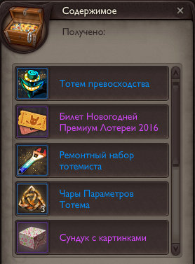 Друзья, у Снегурочки Ди отличные новости: поступили в продажу за лаббиты премиум подарки и предновогодние подарки. Роскошный подарок обязательно содержит: Один из четырех новых тотемов, Билет Легендарной новогодней лотереи, Сундук с картинками, а также несколько новогодних предметов экипировки. Кроме того, с вероятностью 10% в таком подарке находится специальная Новогодняя Гемма, а с вероятностью 3% - Набор кладоискателя! Спешите дарить подарки близким и друзьям, а также не забудьте себя =) |