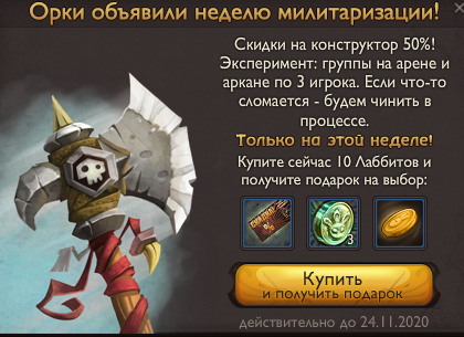 Зарабатывайте конфеты, выполняя задания, и прокачивайте ими Джека. Он не останется в долгу. Это событие вернулось в игру практически без изменений, кроме двух важных моментов. Во-первых, за 100 конфет добавлено новое достижение. Во-вторых, сдав 100 конфет, игрок получит в подарок сундук, который в 2014м году стоил 22 Лаббита. Учтите, что на задание Джека действует Клепсидра, поскольку именно так это работало в 2014-м.